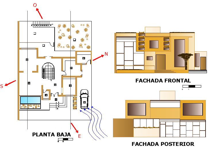 Plans include both side elevations. Floor plans will include notes to specify finishes, construction methods, or symbols for electrical items. Family House detail DWG file.