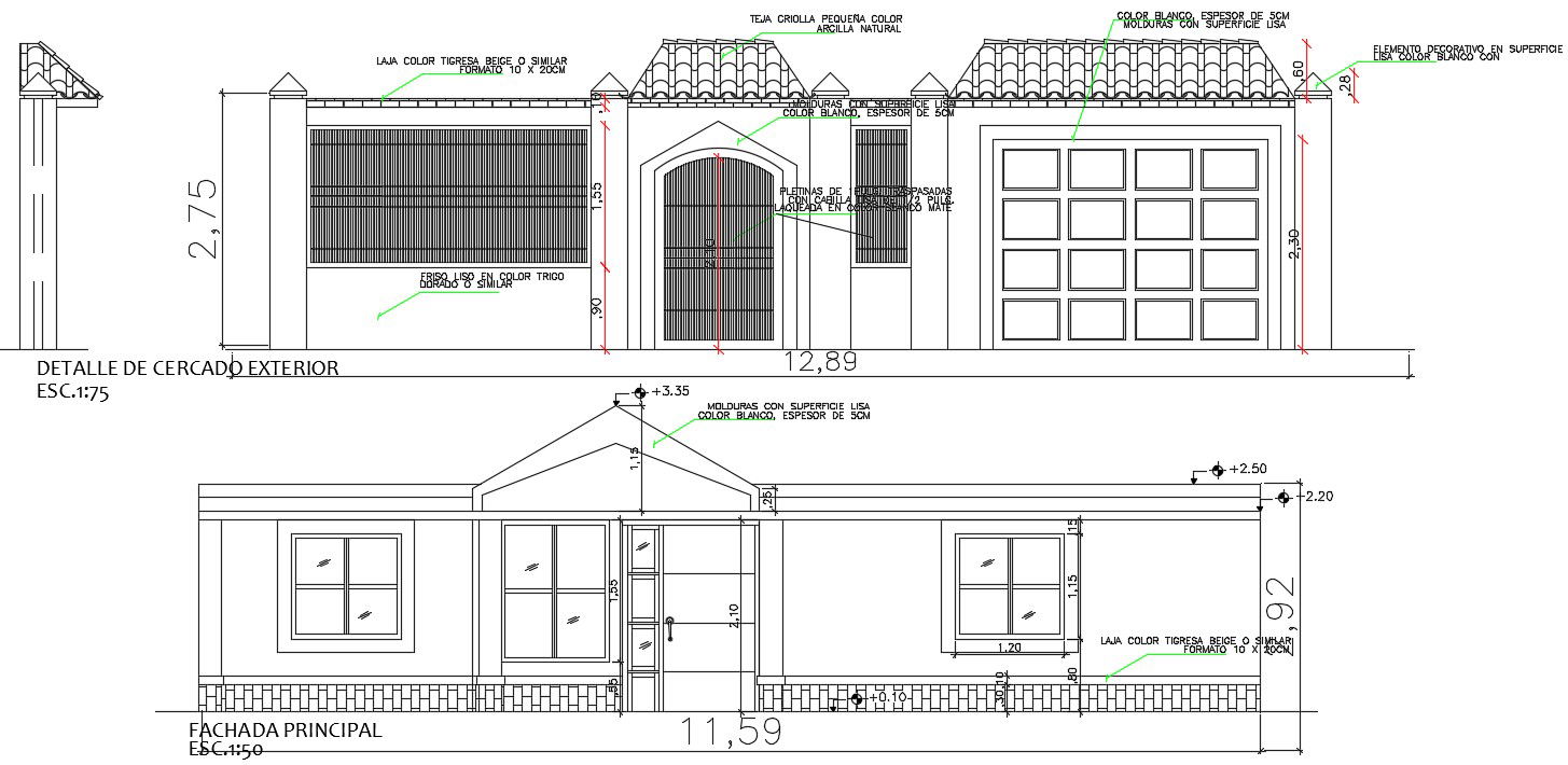 Elevation drawing of building in autocad which include details of front elevation, door details, window details, roof plan, and floor level, etc.