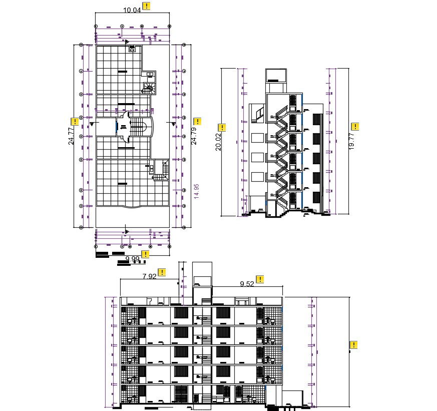 Drawing of a residential building in autocad which includes details of the section, detail of floor level, etc it also includes details of Terrance plan, details of the toilet, details of the staircase, details of the window, etc.