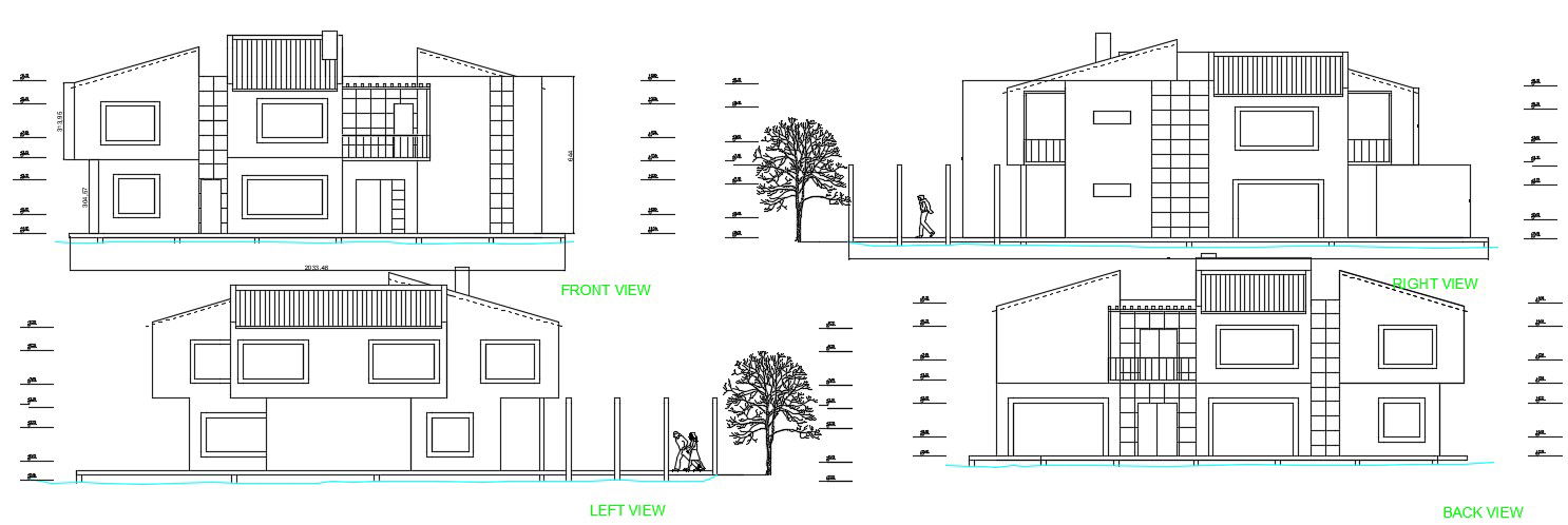2 storey bungalow design in autocad which includes the details of front elevation, back elevation, left elevation, right elevation, etc it also includes the details of floor level.