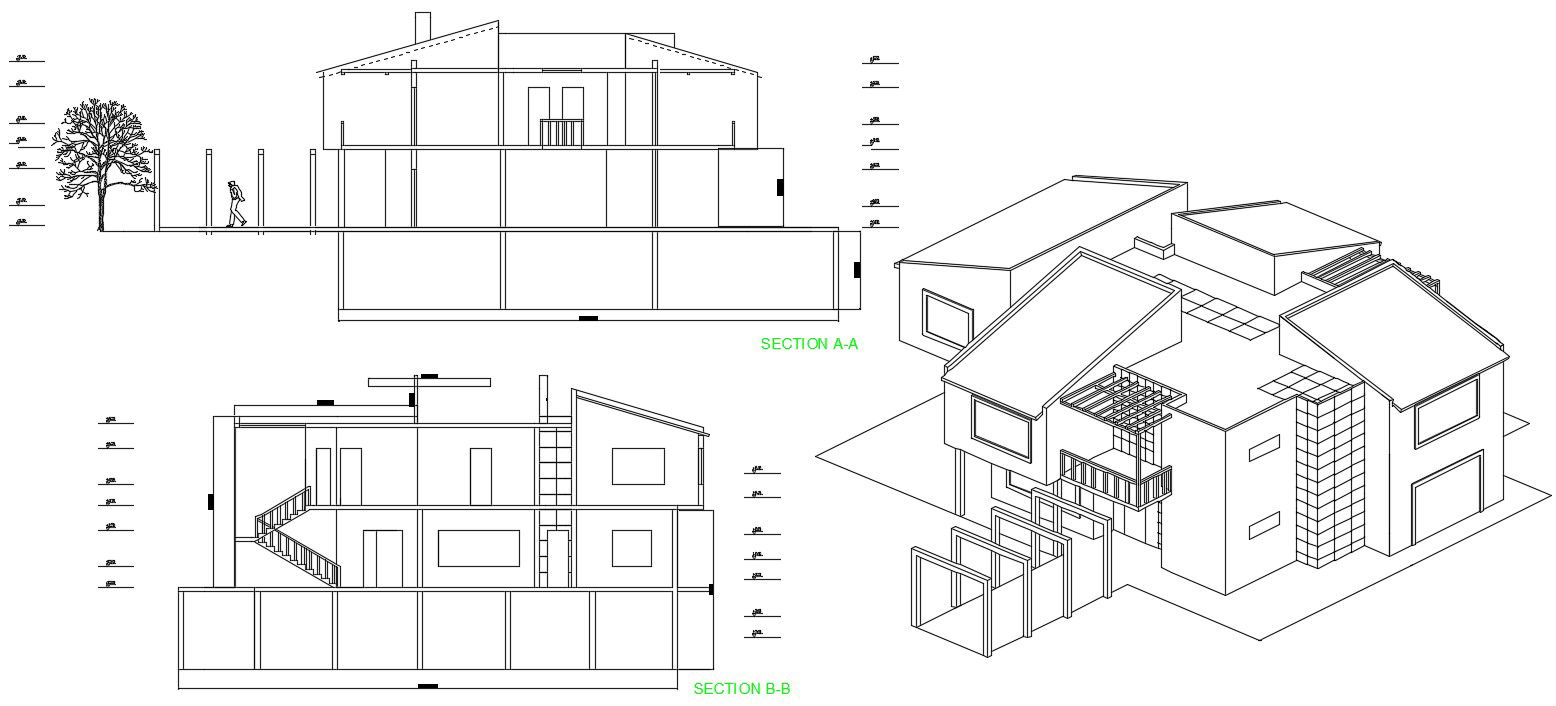 Design of bungalow in dwg file which includes details of different section it also includes the details of floor level and isometric view.