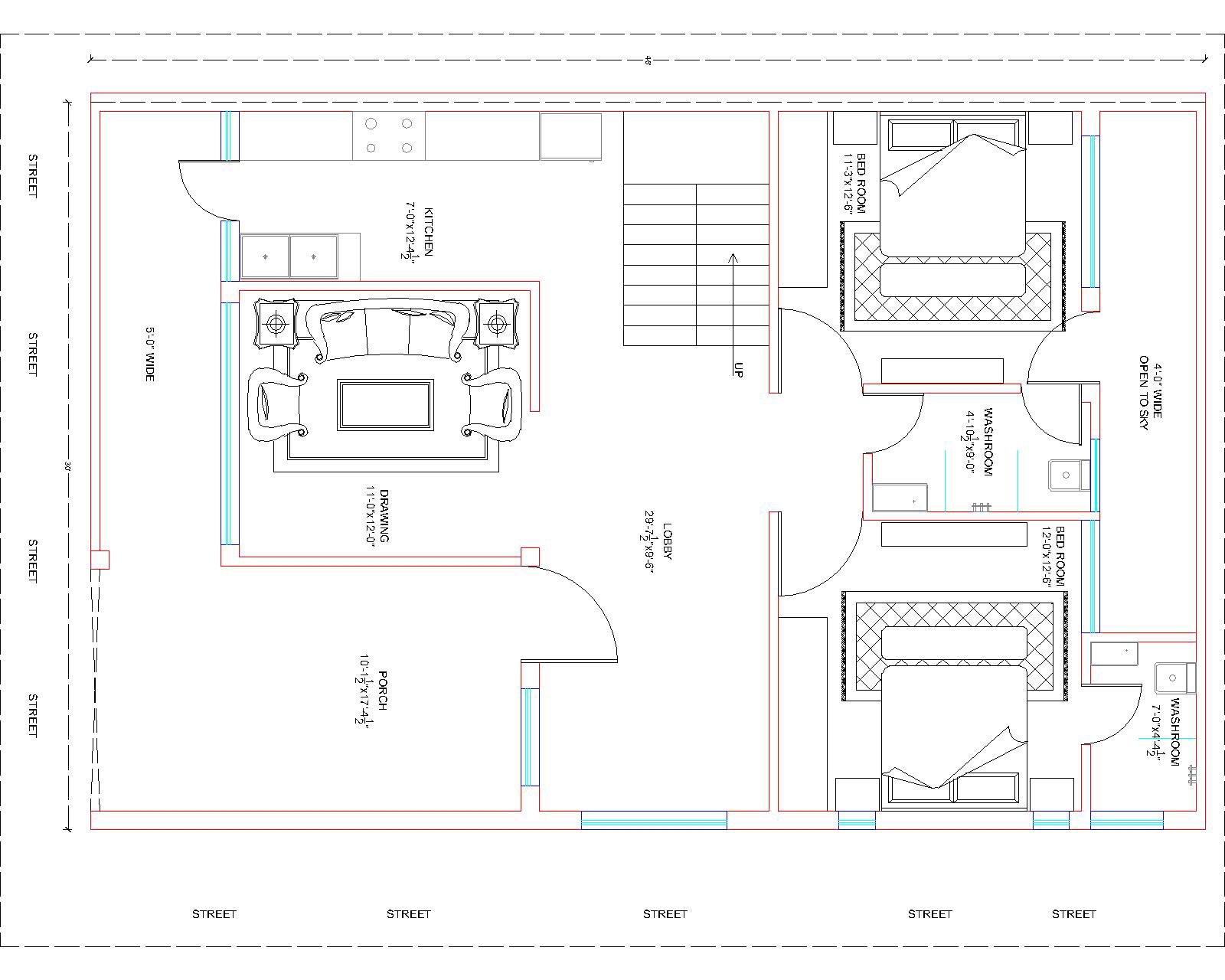 30'x46' House Layout Plan Ground Floor, with furniture layout details,washroom fixture details, kitchen details with dimensions.