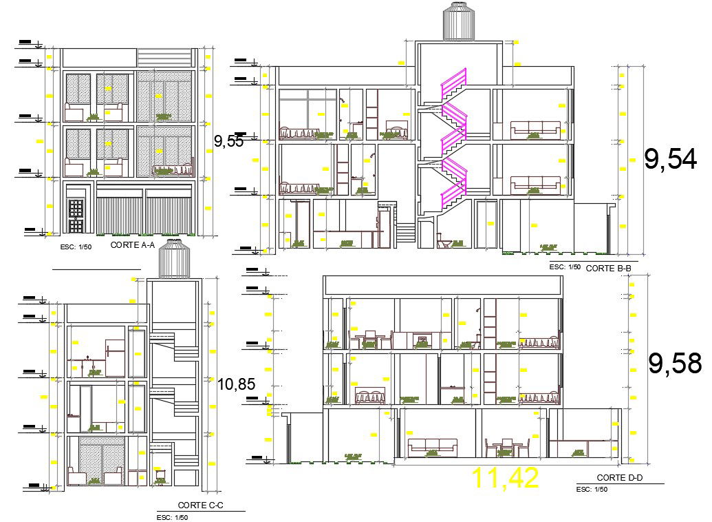 Family house plan with detail dimension in autocad which includes the details of different section, hall, bedroom, drawing room, staircase, etc, it also includes the details of floor level and furniture details.