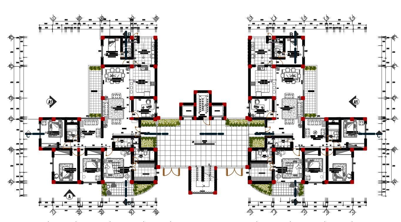 Design of multi-family house plan in autocad which includes the details of the hall, multiple bedrooms, Drawing room, dining room, washroom, toilet, kitchen, etc it also includes the details of furniture and floor level.