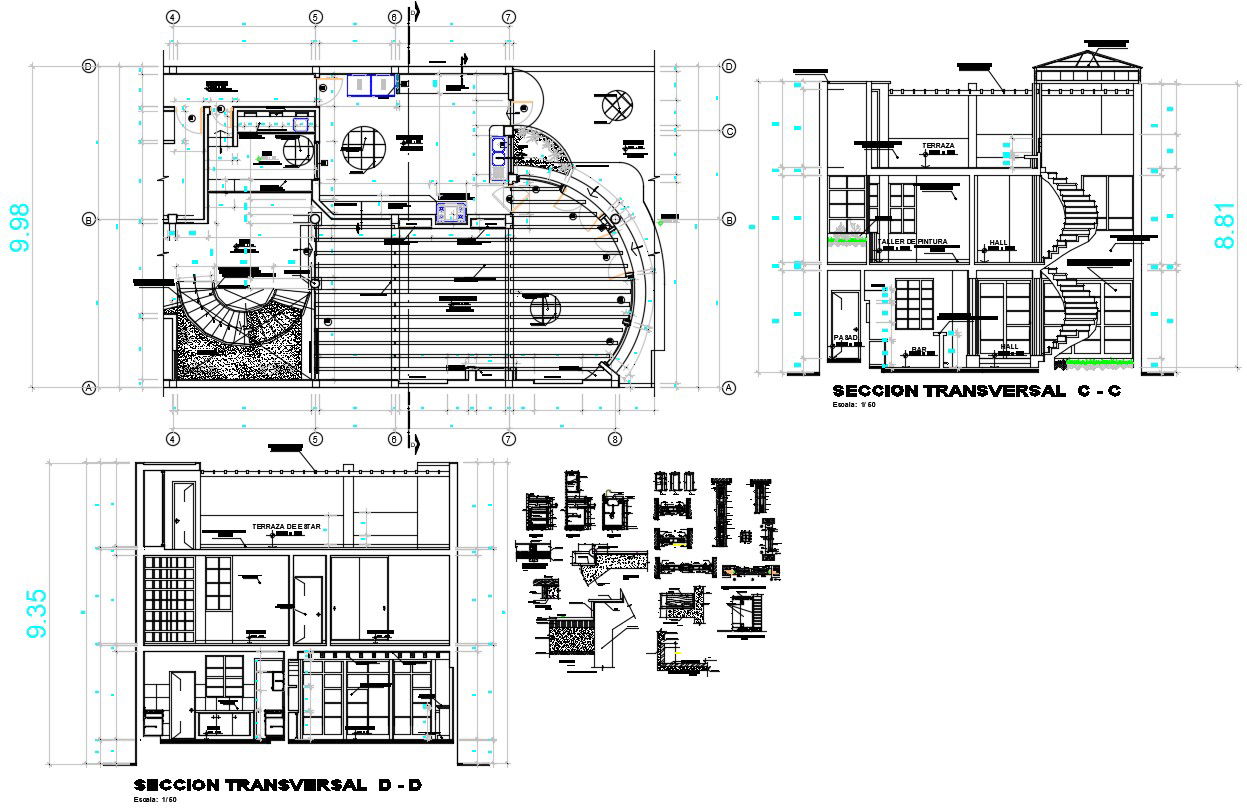 Drawing of 2 storey bungalow with detail dimension in autocad which includes details of different section,