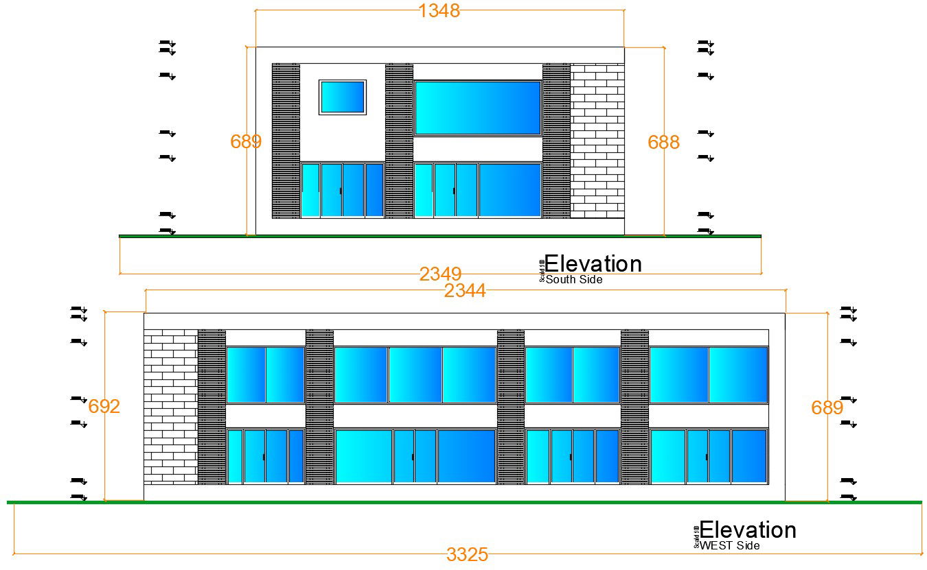 Elevation drawing of a modern house in autocad which includes detail dimension of south side and west side.