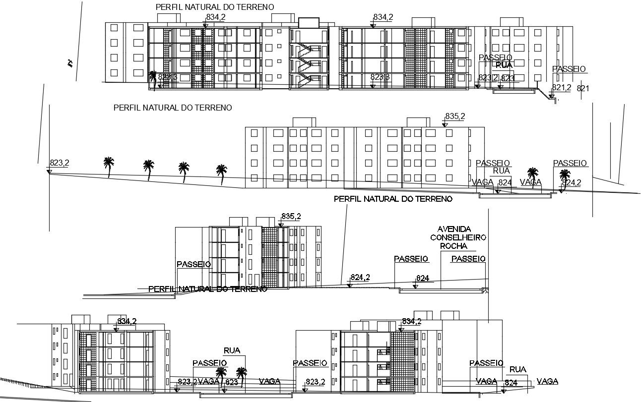 Multifamily apartment plan in autocad which includes elevations of apartment, it also includes front elevation, back elevation, side elevation, etc, it also includes the dimension of the street, passage, vacancy, avenue advisor rock.