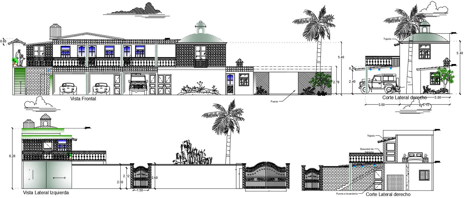 Villa layout plan in autocad which includes front elevation, back elevation, and side elevation, etc, it also includes the dimension of the parking area, balcony area, bedrooms, furniture details, entrance area, exit area, etc.
