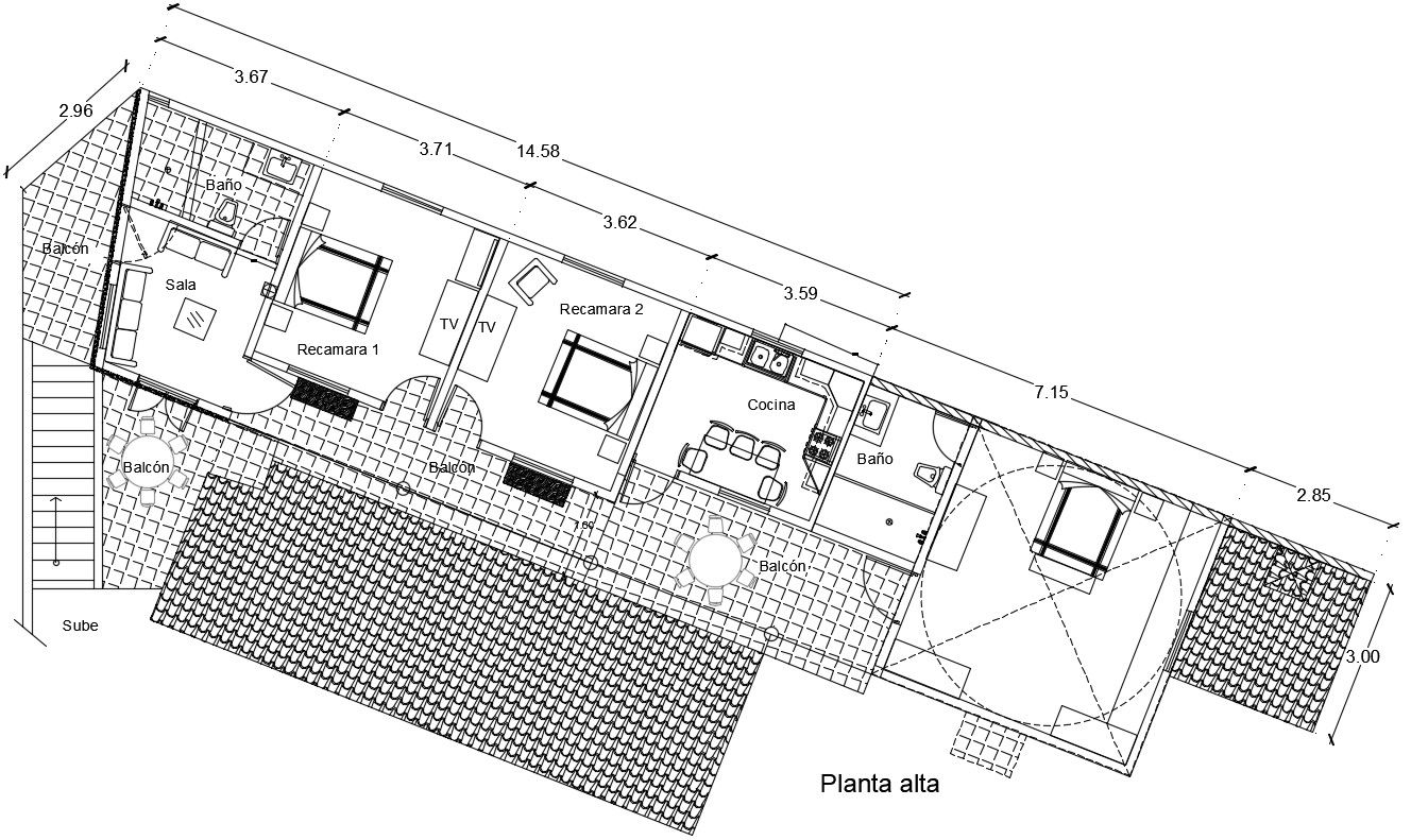 Furnished Top floor plan of the house in autocad which includes living room, tv area, kitchen, dining area, bedroom, master bedroom, etc, it also includes detail dimension of the staircase, bathrooms, toilets, furniture, etc.