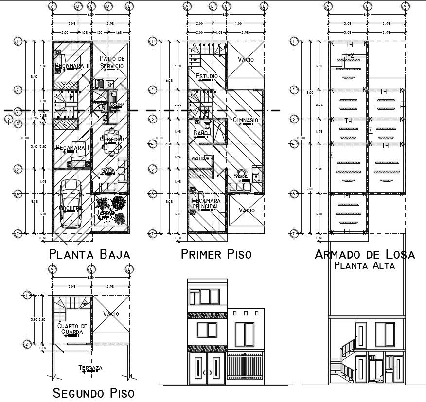 2d cad drawing plan of the apartment which includes the dimension of the parking area, staircase, living room, kitchen, dining area, bedrooms, bathroom, toilets, patio, terrace, etc, it also includes front and back elevation, etc.