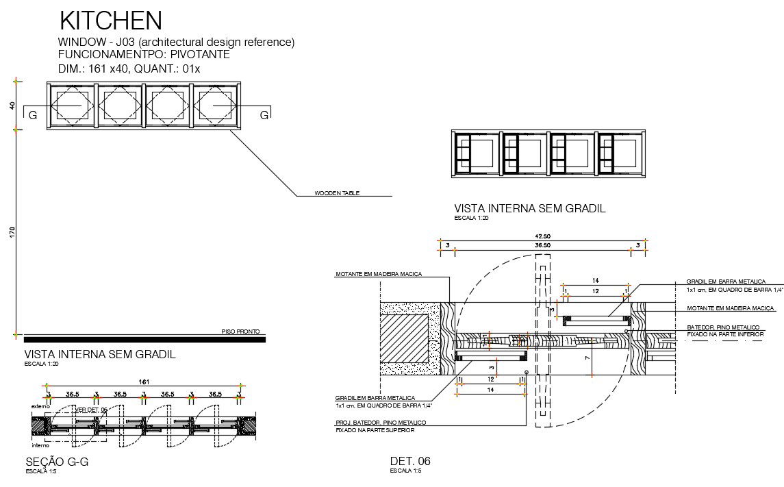 Kitchen window drawing in autocad which shows the detail information of kitchen window with an internal and external view, it also includes foundation details of windows.