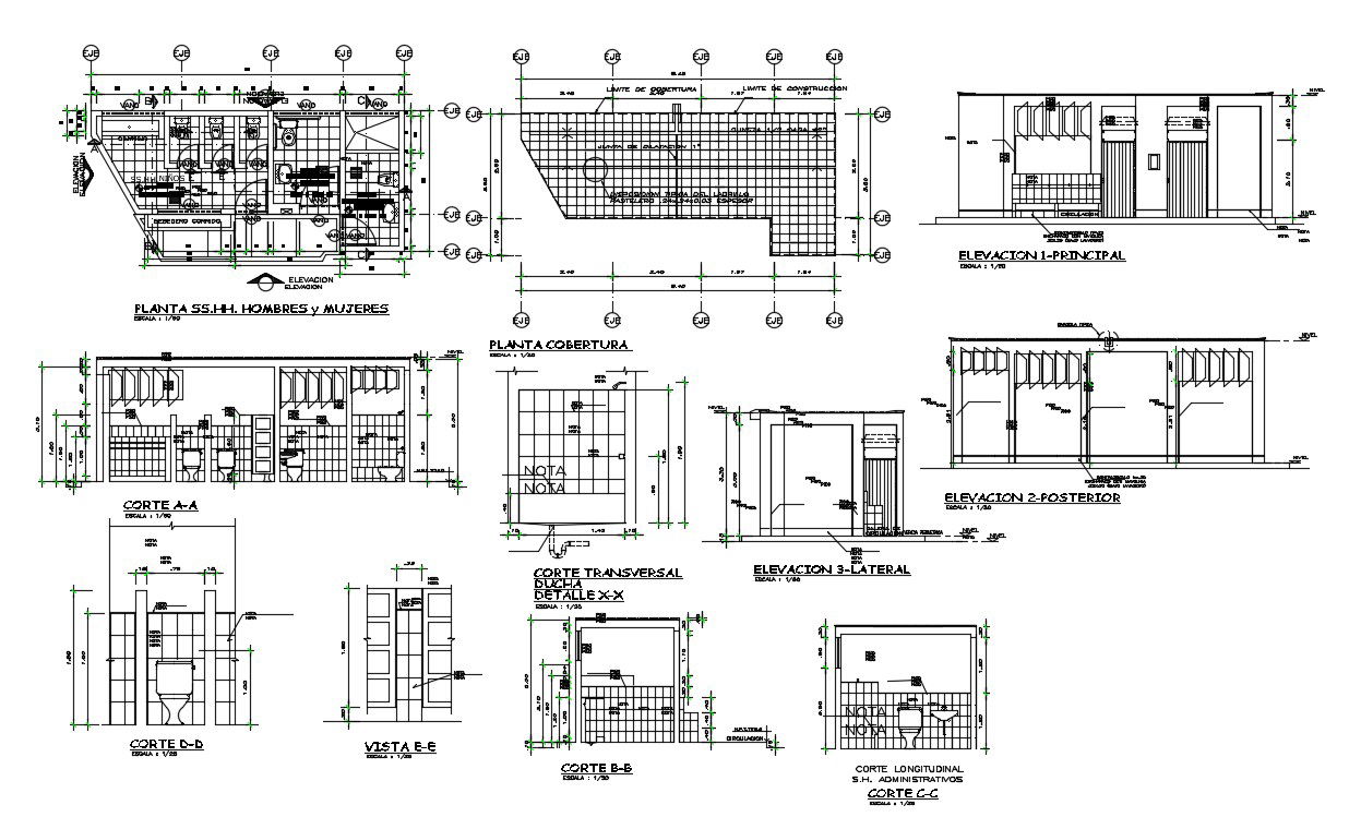 2d cad drawing of College campus in autocad which includes the details of elevation, section details, coverage details, details of building view, washroom details, etc.