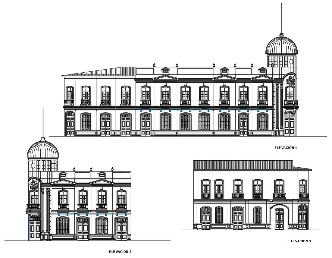 Elevation of the palace in autocad which includes elevation, side elevation, front elevation, back elevation, door, window, gate, balcony, etc, it also shows the of the conical spire.