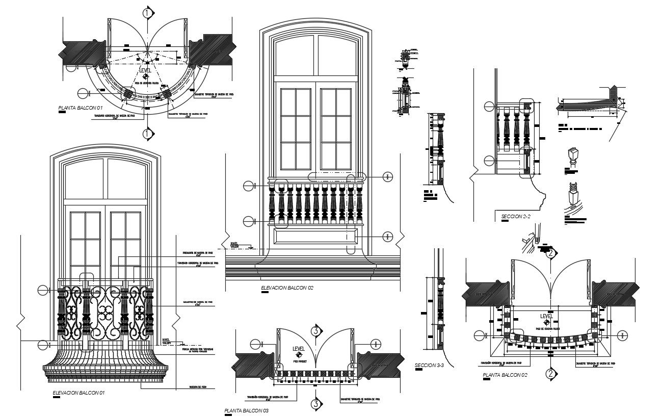 Balcony elevation in autocad which shows the balcony, floor details, section details, door details, window details, balasutre details, gate details, etc.
