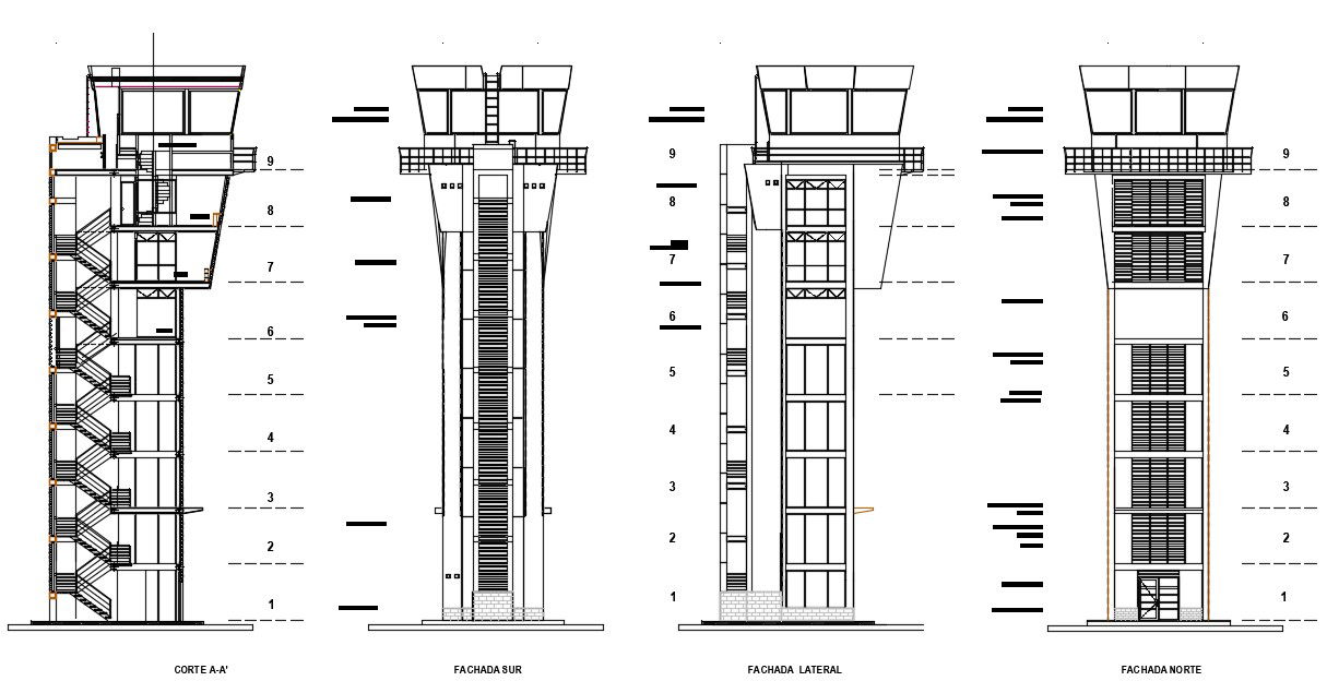 tower elevation and section with detail dimension in autocad which includes the details of different types of elevation like south, north, back, etc, it also shows the different types of section.
