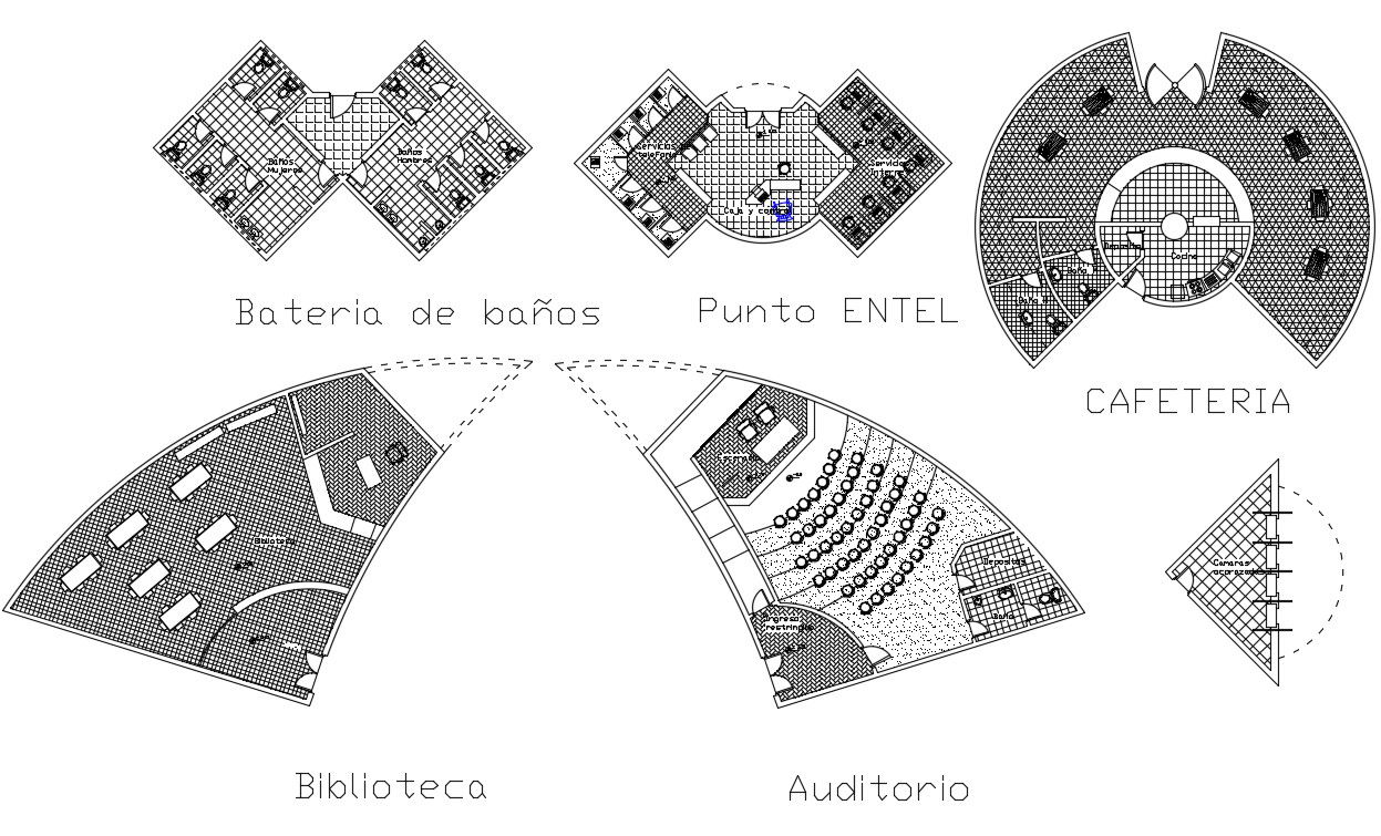 Office layout plan in autocad which includes the details of the reception area, auditorium room, gate, cafe area, chair, waiting room, washroom, etc.