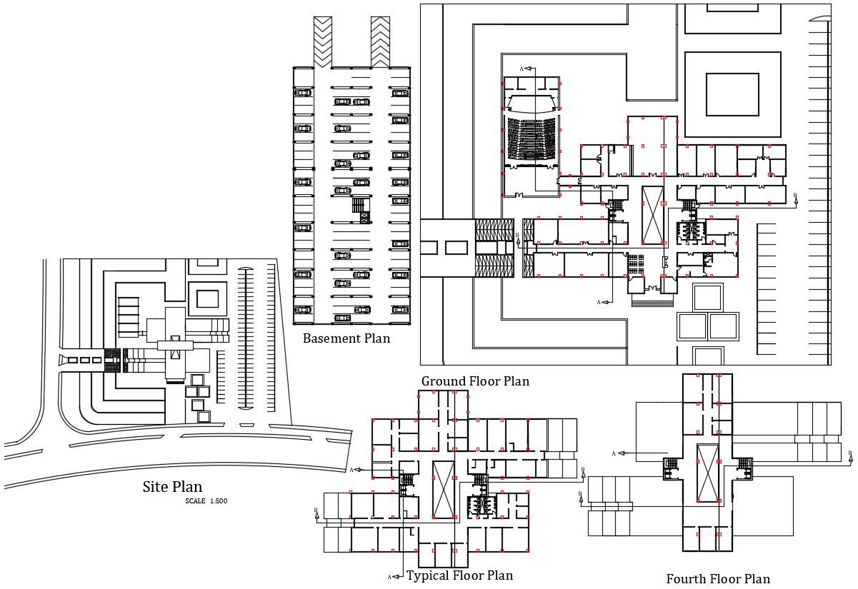 Building plans in AutoCAD which includes the details of the basement plan, site plan, typical floor plan, ground floor plan, parking area, etc.