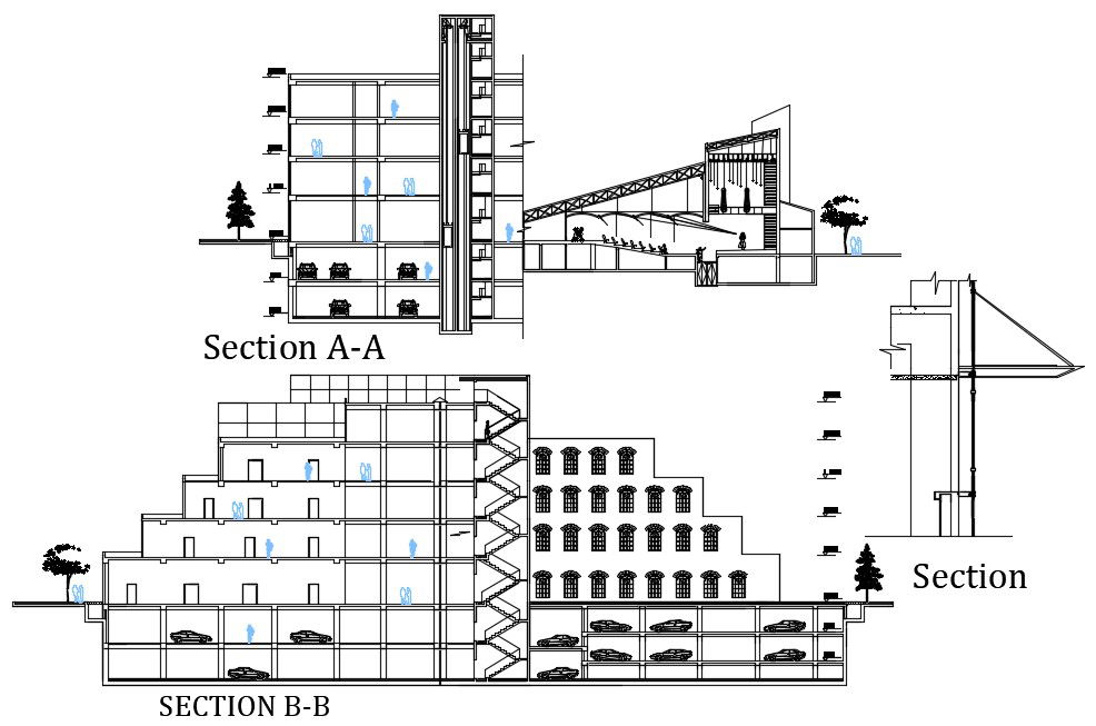 building section drawing in AutoCAD which includes the details of the staircase, doors, windows, parking area, lawn area, etc, it also includes the details of floor level.