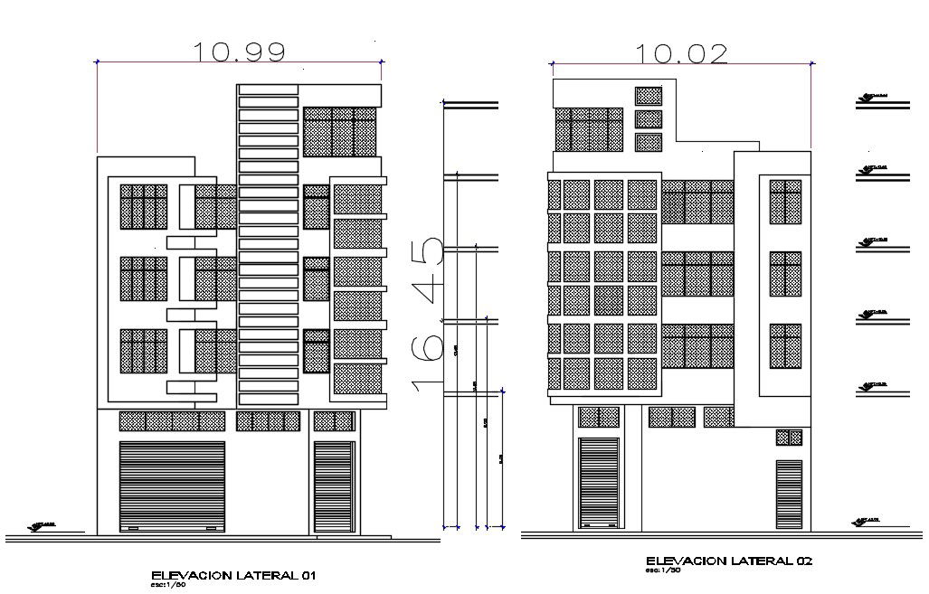 building elevation design in DWG file which includes the different types of elevation, door details, gate details, etc, it also includes the details of floor level.