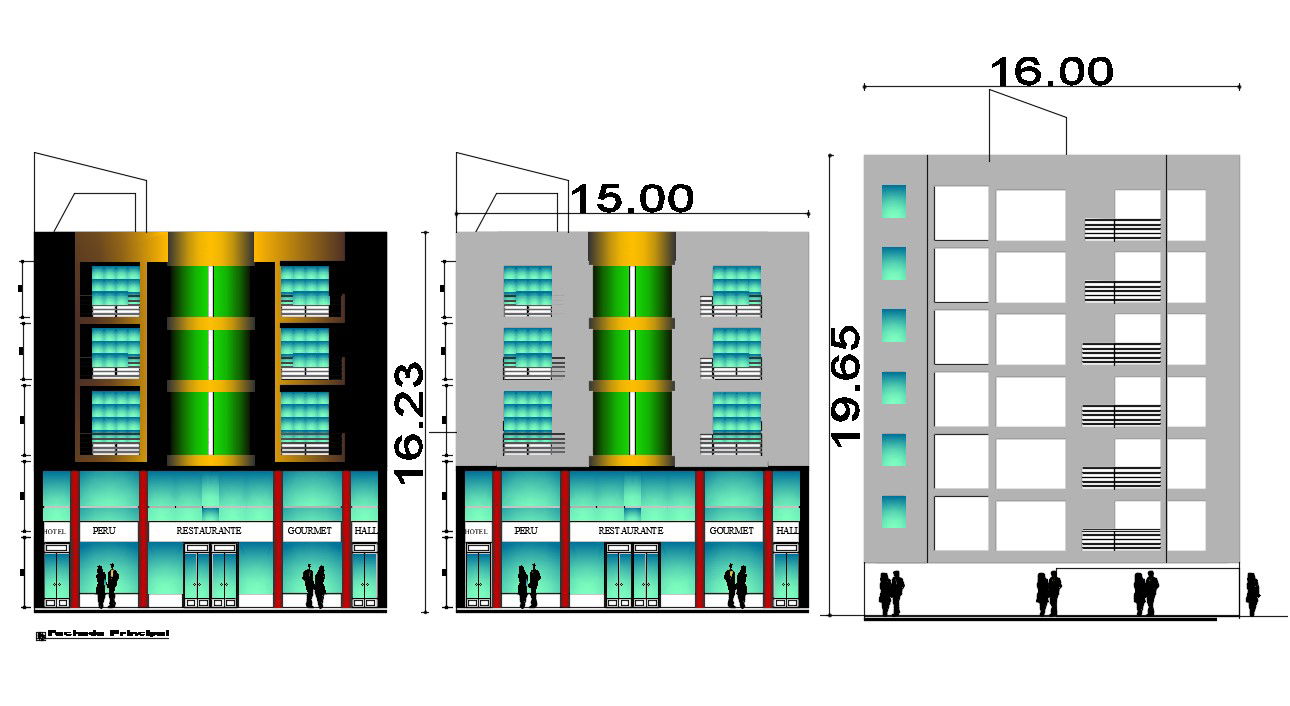 Restaurant building in AutoCAD which shows the different types of elevation, door details, main gate, balcony view, etc it also includes the details of floor level.