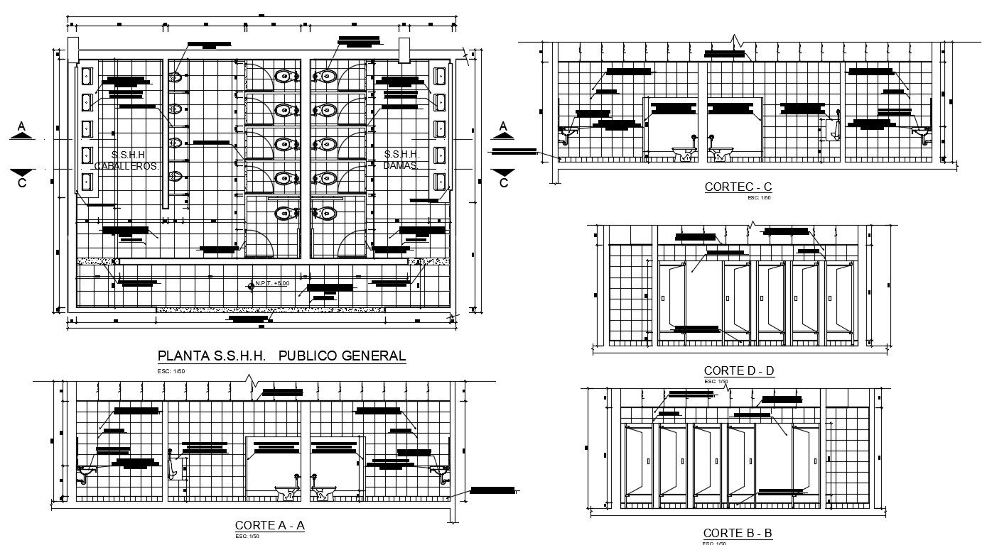 Sanitary plan in AutoCAD which includes the section with a detail dimension, it also provides the details of the washroom, floor level, and washbasin.