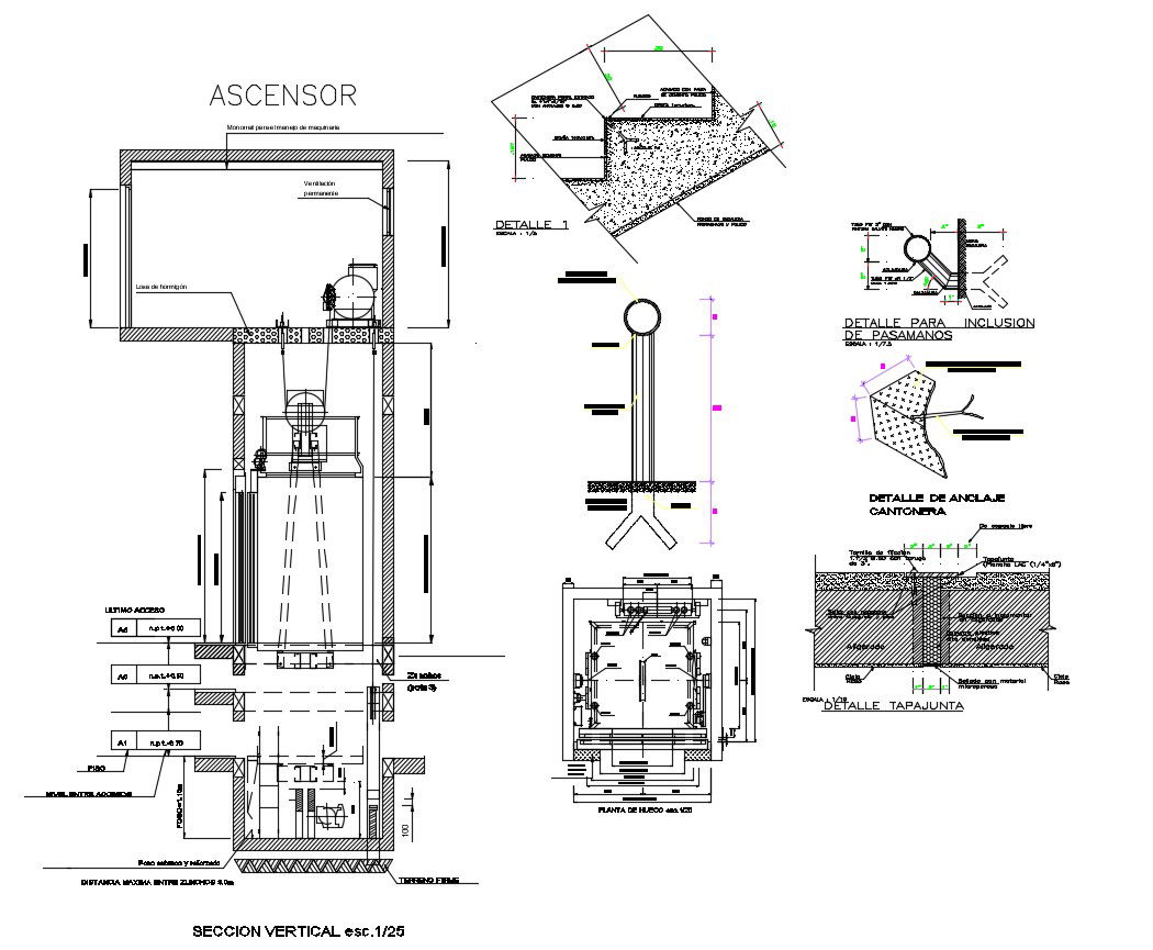 Design of lift in DWG file which includes the section drawing of lift, foundation structure, floor level, etc, it also shows the concrete masonry details along with a concrete mix of cement, sand, and aggregate.
