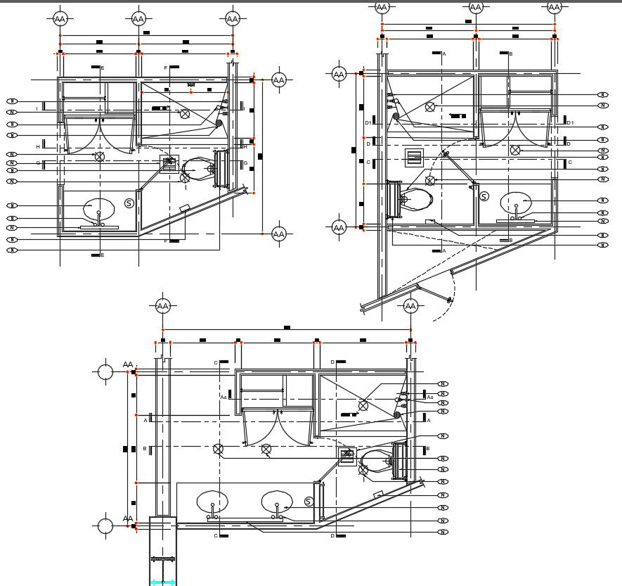 Drawing of the bathroom in AutoCAD which includes the door details, water closet details, washbasin, etc.