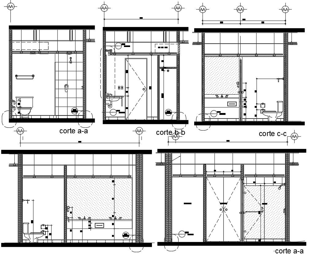 bathroom drawing in DWG file which provides the section with detail dimension, washbasin, water closet, door details, mirror details, etc, it also shows the furniture details.