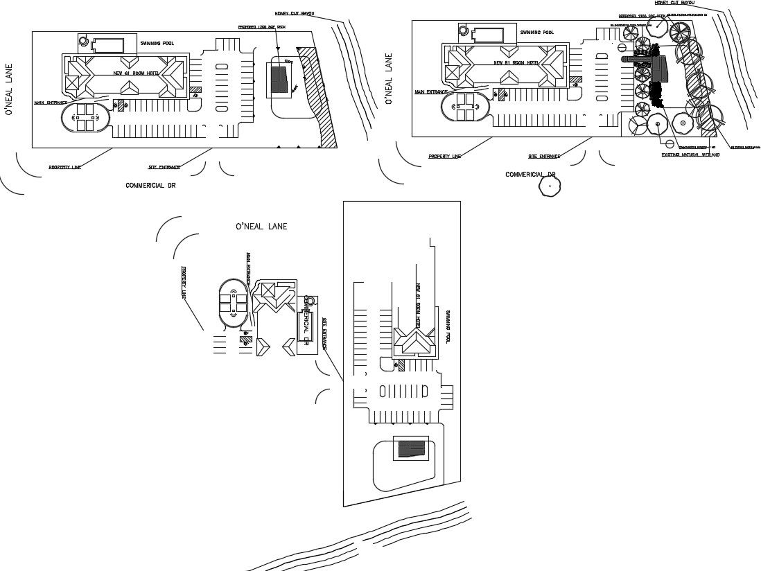 Hotel plan in DWG file which includes the details of the main gate, room, reception area, washroom, swimming pool, side gate, lawn area, etc.