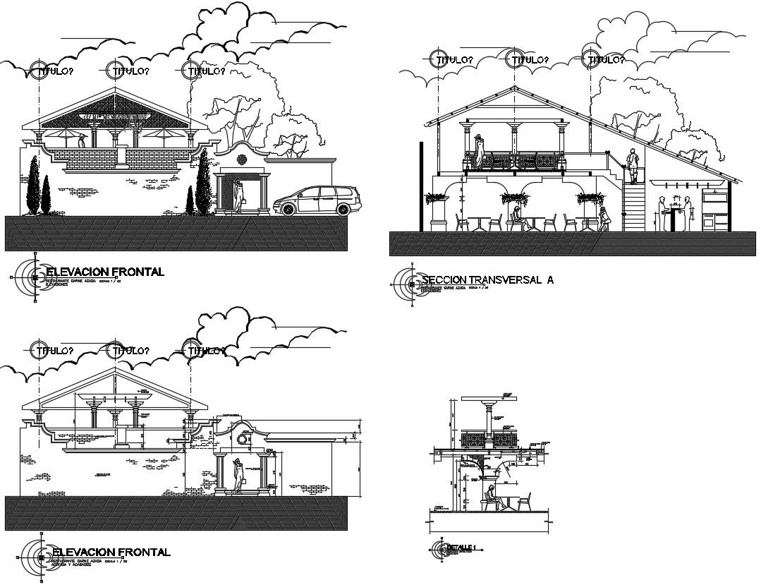 Restaurant drawing in AutoCAD which shows the front elevation it also shows the section with detail dimension and furniture details.