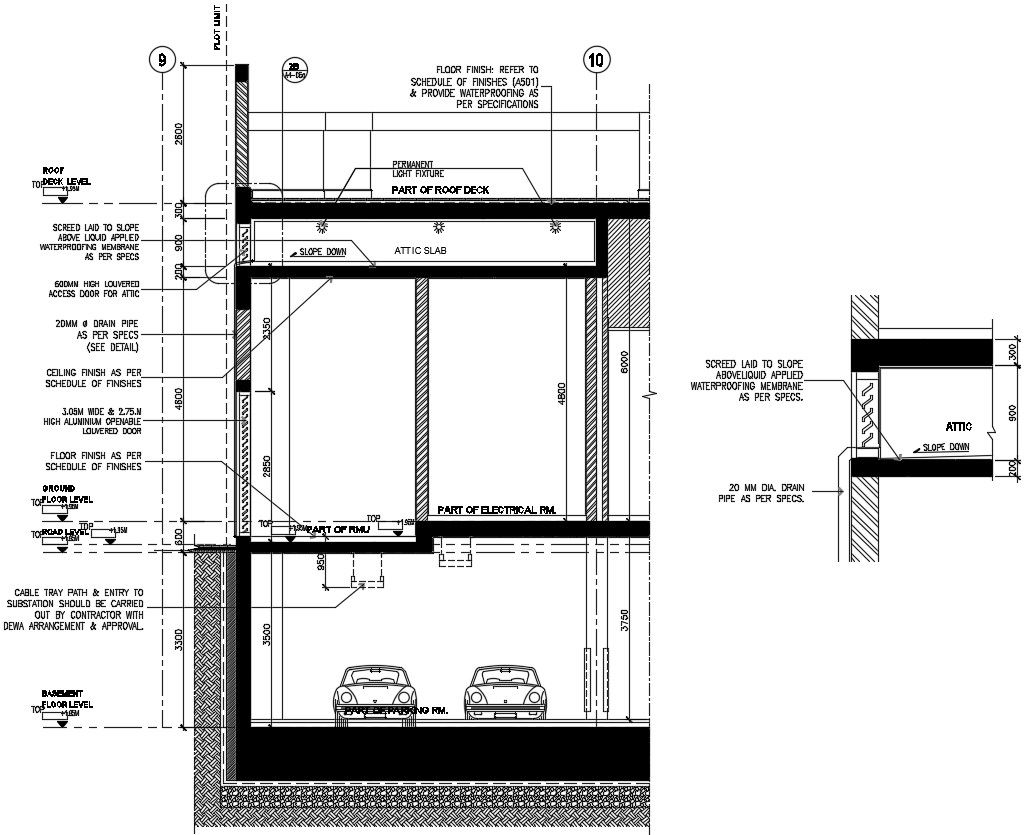 Section drawing in AutoCAD which includes the details of the section, attic slab, RMU, part of electrical, part of the roof deck, parking area, etc.