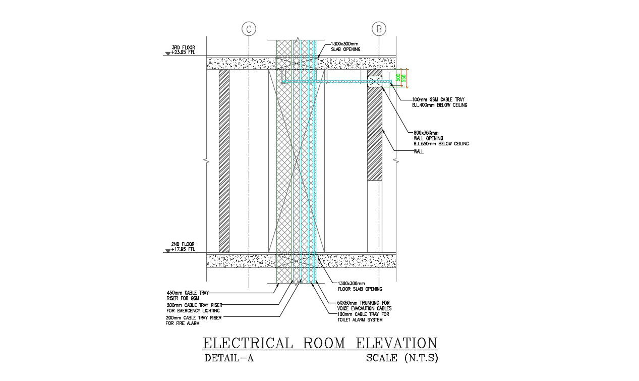 Electrical room layout in DWG file which includes detail dimension of cable tray riser for GSM, emergency light, fire alarm, slab opening, cable for a toilet alarm system, etc.