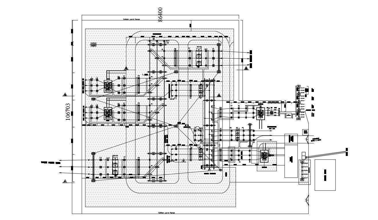 Substation layout design in DWG file which includes detail dimension of fuel tanks, control room, guard room, gibe line, fence, cable sealing, switchyard fence, lighting arrestor, disconnector, circuit breaker, voltage transformer, circuit transformer, earthing switch, underground cable.