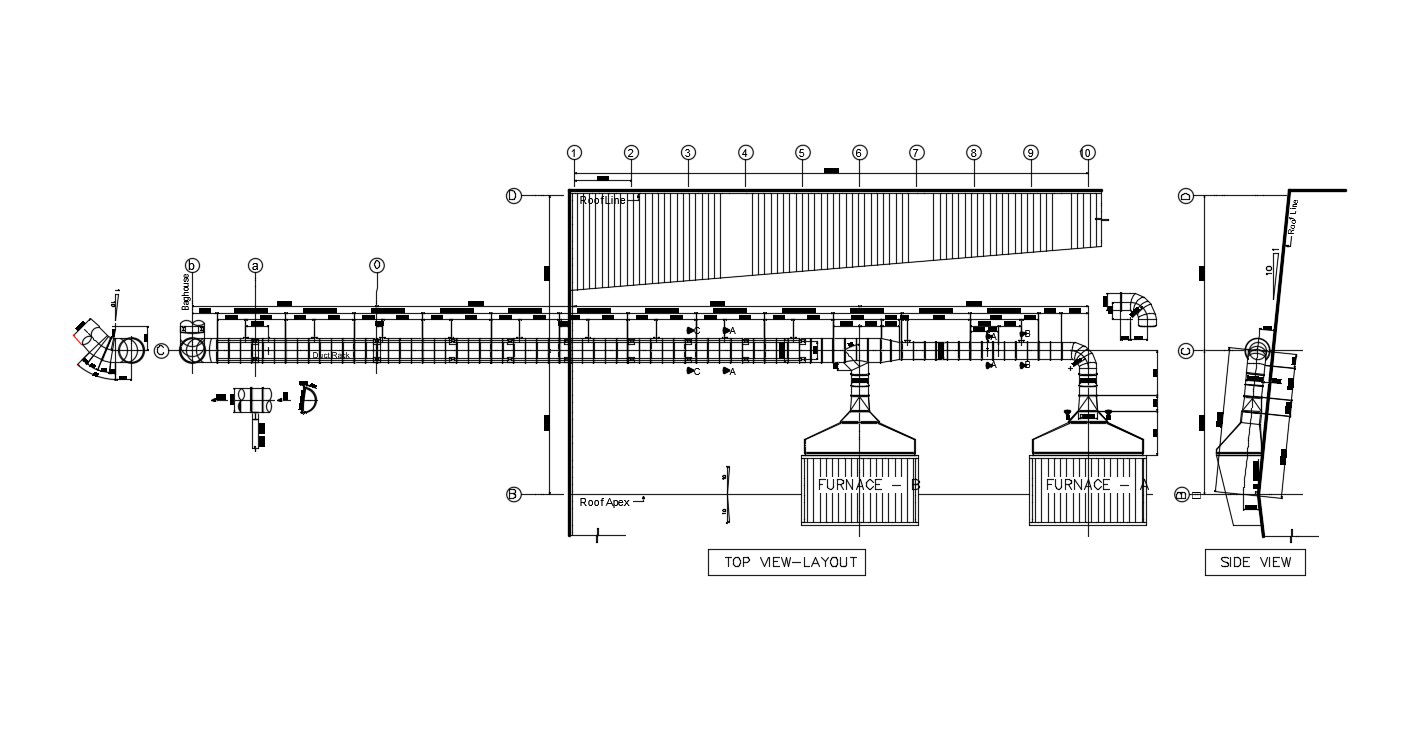 Roof structure in DWG file which includes detail dimension of duct area, roofline, roof apex, entrance area, exit area, etc, it also includes top elevation and side elevation, etc.