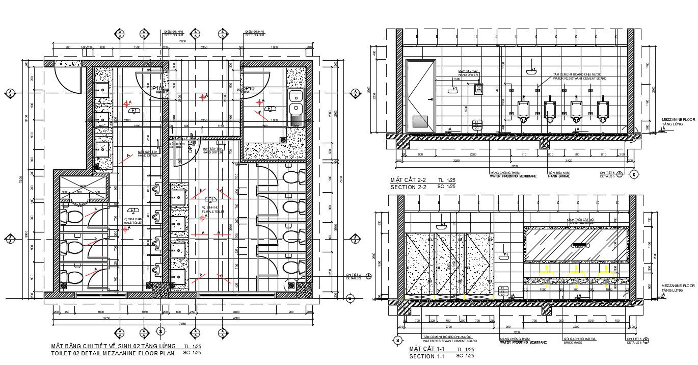 Public toilet plan in AutoCAD file which includes detail of water closet section drawing, detail of washbasin, detail of floor level, etc.
