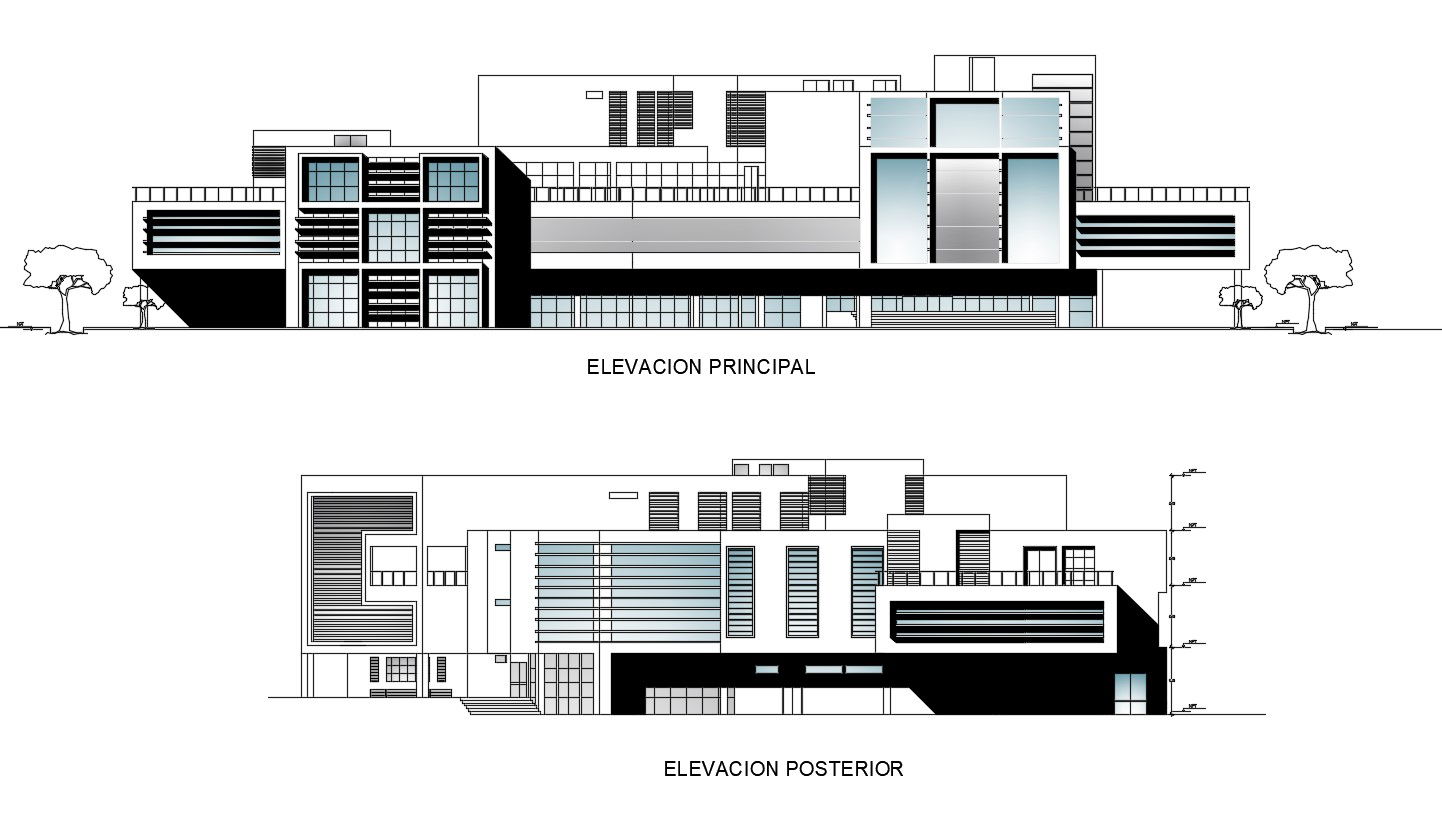 Elevation 2d drawing of commercial building hub dwg file that shows building units different sides of elevation like front elevation and side elevation with floor level entrance door details.