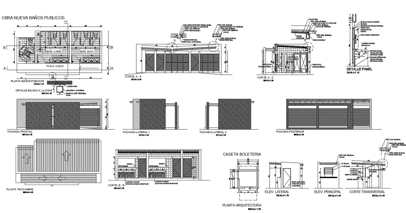 Drawings plan elevation and section of sanitary public toilet dwg file