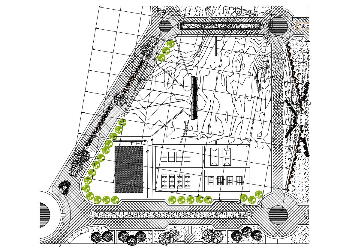 CAD topographical contour planning of an area 2d drawing dwg file that shows contour lines details along with landscaping details and road networks details existing building details also included in drawings.