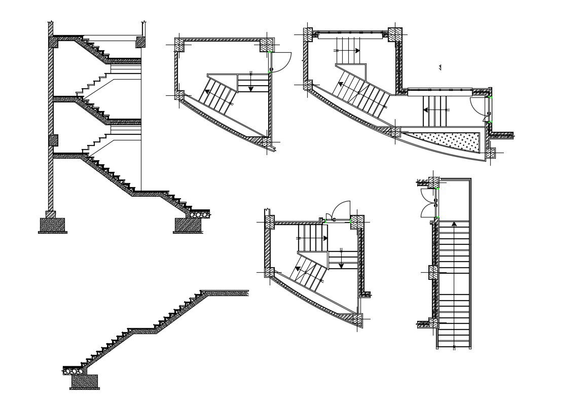 CAD plan and elevation and stairway construction dwg file that shows stairway plan details along with riser tread details. Railing details and riser height and tread width details also included in drawings.