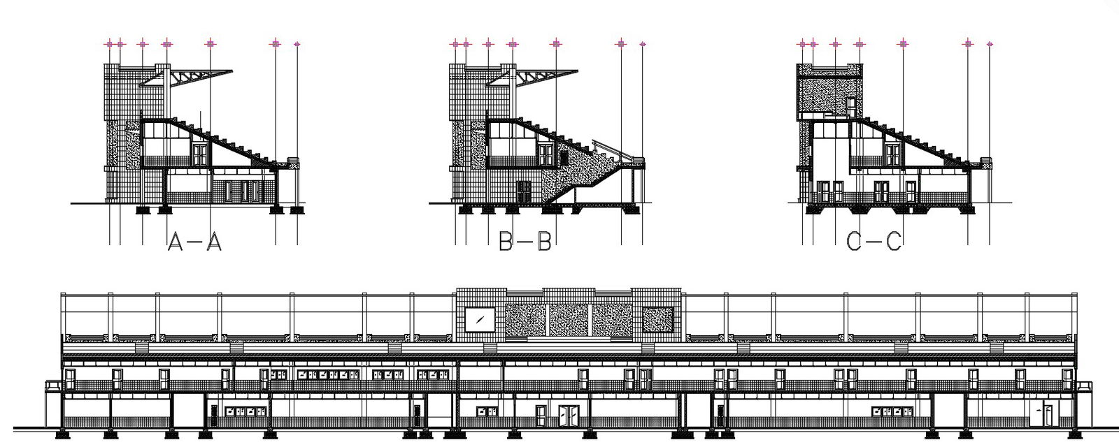 Drawings details of sports building elevation and section dwg file that shows front elevation of sports building with entrance and exit way details along with sectional details of building. Audience seating arrangement details with roof shade details also included in drawings.