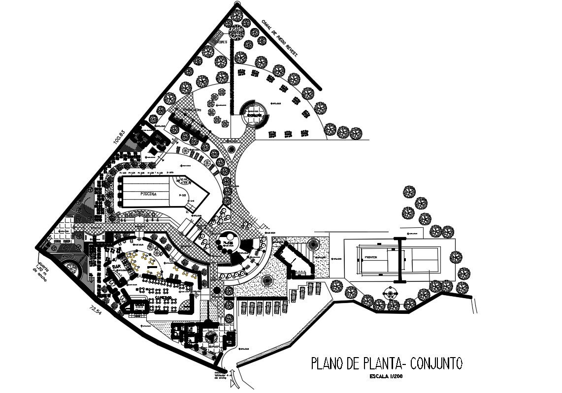 CAD layout 2d plan of hotel building area details in autocad file that shows work floor plan drawings details of building with floor level details and landscaping details in area, boundary wall details, parking space details, entrance gate details also included in drawings.