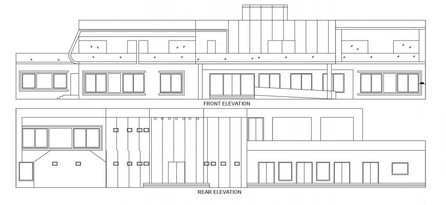 2d cad drawing of Clubhouse front and rear elevation design inclueds dooe and window detail, wall design in autocad file, download free cad file and use cad presentation