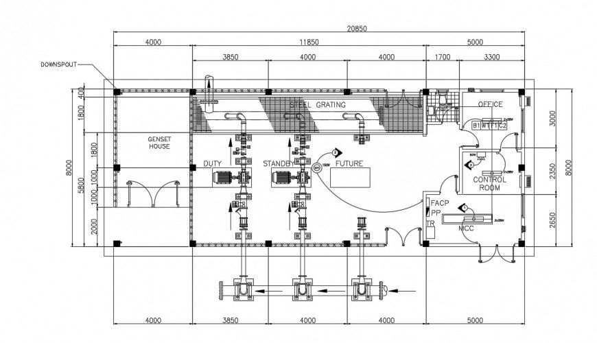 Lighting layout plan in dwg file which includes detail dimension of power panel, motor, isolator switch, pin light, diesel generator, circuit breaker, control transformer, etc.