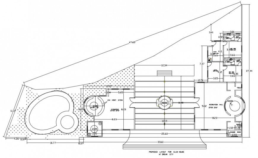The architecture proposed layout plan for clubhouse top view showing that swimming pool, bedrooms, gymnasium, reception hall, changing room and landscaping design along with all furniture detail and dimension design, download free dwg file clubhouse and use for multipurpose cad presentation