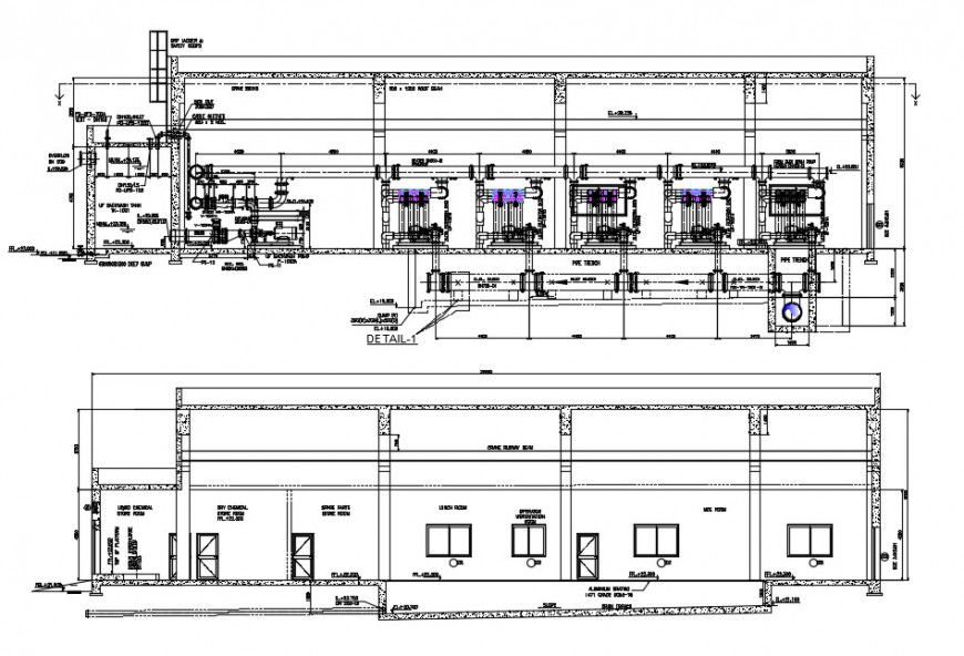 2d cad drawing of industrial plant with office layout plan along with elevation with floor and windows are shown in with all blocks shown in drawing and brick wall elevation showed and description and mentioned dimension detail cad file.