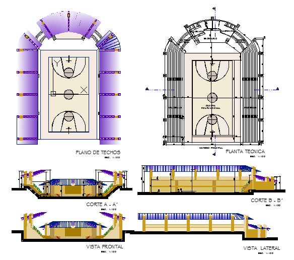 This drawing Design Draw In Autocad Format. layout plan, site plan, section and elevation plan of stadium project. Modern Sport Centre Download file.