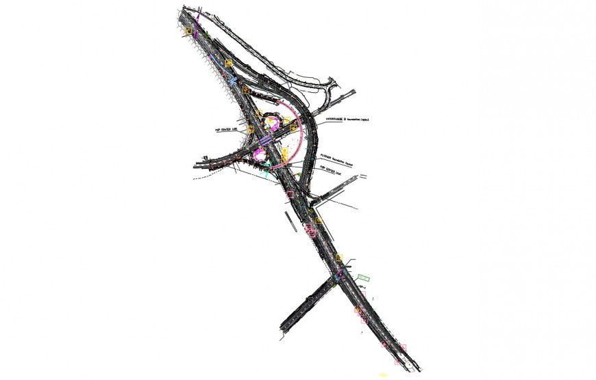 Flyover plan in dwg file which includes detail dimension of splice point, transformer, interchange, detour road, boundary road, etc, it also includes detail dimension of MV, PVC, UPVC duct, medium voltage switch, low voltage panel, substation with medium and low switches, etc.
