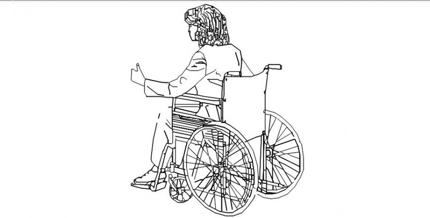 Handicap 2d model detail dwg file. here there is front sectional detail of a wheelchair model with a women sitting on it in a posture in 2d form