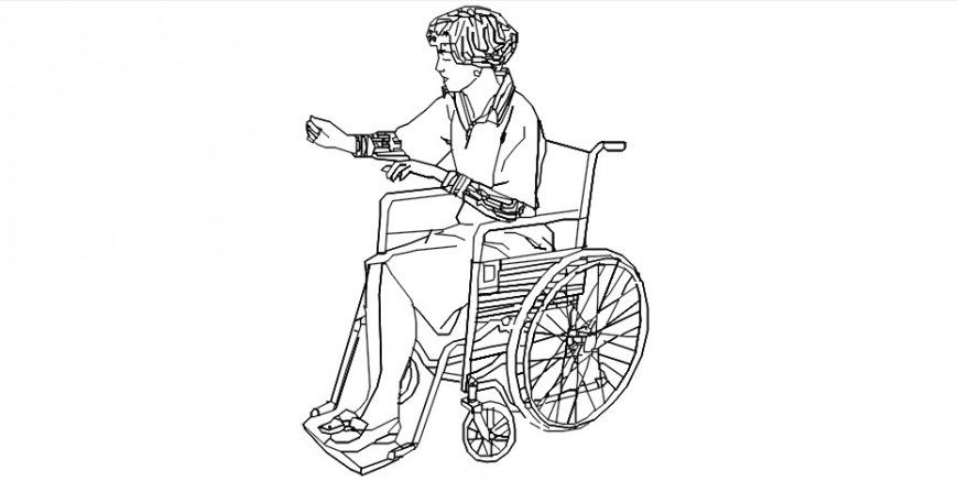 Handicap 2d model detail dwg file. here there is front sectional detail of a wheelchair model with a women sitting on it in a posture with a robotic style and operated machine hand in 2d form