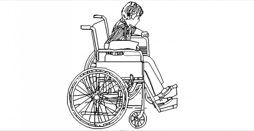 Handicap boy 2d sketch model file. here there is side sectional elevation model detail of a boy handicap siting on wheel chair detail in auto cad format